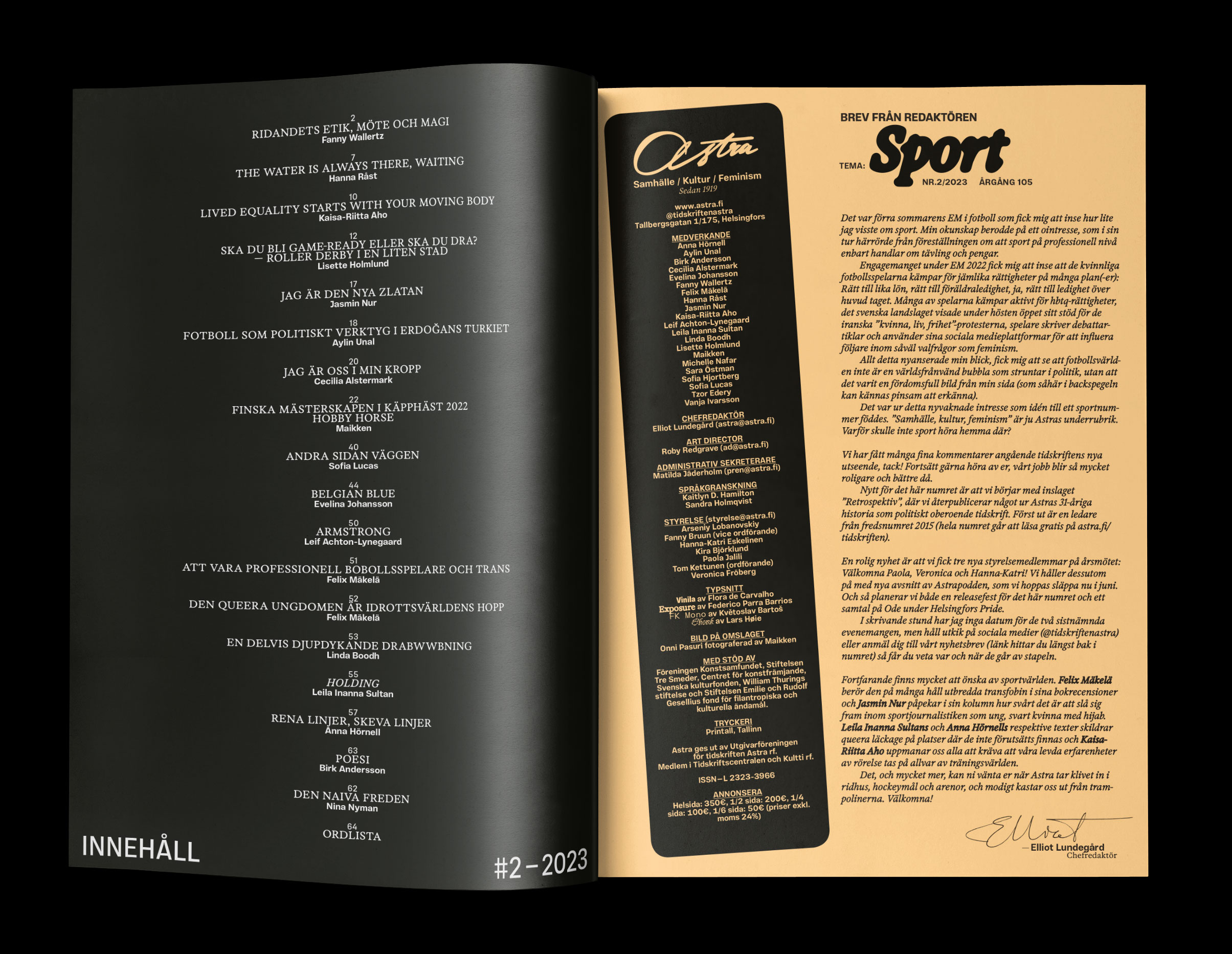 Numret ger oss flera bokrecensioner om hbtq-personer inom idrotten, noveller som synar begär, sexualitet och maskulinitet, och bidrag till debatten om vem som är välkommen in i sportens värld. Vi bjuds även med på en rörande visuell resa in i finska käpphästmästerskapen och ombeds reflektera över etiska dilemman inom ridsporten. Här finns även texter som behandlar mötet mellan konst och sport – vad händer när dessa ofta åtskilda sfärer tillåts spilla över i varandra?