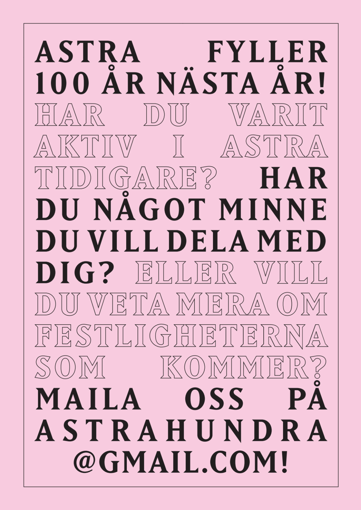 Astra fyller 100 år nästa år! Har du varit aktiv i Astra tidigare? Har du något minne du vill dela med dig? Eller vill du delta i festligheterna? Maila oss på astrahundra@gmail.com