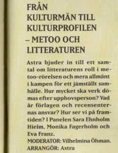 I detta avsnitt kommer vi att få höra en inspelad paneldiskussion som Astra ordnade under Helsingfors Bokmässa hösten 2018. Astra bjuder in till ett samtal om litteraturens roll i metoo-rörelsen och mera allmänt i kampen för ett jämställt samhälle. I panelen Sara Enholm Hielm, Monika Fagerholm och Eva Frantz. Samtalet leds av Vilhelmina Öhman.