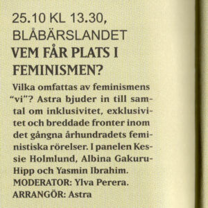 I detta avsnitt kommer vi att få höra en inspelad paneldiskussion som Astra ordande under Helsingfors Bokmässa hösten 2019. Vilka omfattas av feminismens “vi”? I panelen Kessie Holmlund, Albina Gakuru-Hipp och Yasmin Ibrahim. Samtalet leds av Ylva Perera.